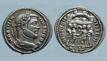| Siscia, Group I, Issue VII, 295 A.D. RIC VI, Siscia, 61 Voetter-Gerin, Siscia, Galerius 3 Galerius as Caesar MAXIMIA-NVS NOB C Laureate head right VIRTVSM-ILITVM Four princes sacrificing over tripod before archway in 6-turreted enclosure. Star SIS in exergue |