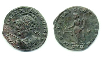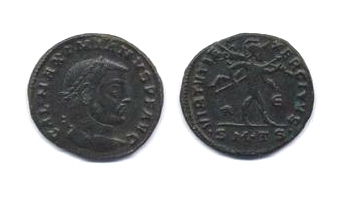 | Treveri, Group I, Issue V, 300-301 A.D. RIC VI, Treveri, 491 corrected (shield & spear left) Voetter-Gerin, Treveri, Galerius 73 Galerius as Caesar MAXIMIANVS NOB CAES Helmeted and cuirassed bust left, holding spear and shield M SACRA AVGG ET CAESS NN Moneta standing left holding scales and cornucopiae. Star in right field, BTR in exergue |