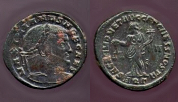 | Aquileia, Group I, Issue VI, 301 A.D. RIC VI, Aquileia, 32b Voetter-Gerin, Aquileia, Galerius 10 Galerius as Caesar MAXIMIANVS NOB CAES Laureate head right SACRA MONET AVGG ET CAESS NOSTR Moneta standing left holding scales and cornucopiae. V in right field, AQG in exergue | ![]() |