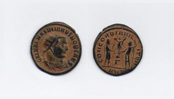 | Antiochia, Group I, Issue II, 297 A.D. RIC VI, Antioch, 61b Voetter-Gerin 13 Galerius as Caesar GAL VAL MAXIMIANVS NOB CAES Radiate, draped and cuirassed bust right CONCORDIA MIL-ITVM Galerius standing right, receiving Victoriola from Jupiter. Star over G in center field ANT in exergue |